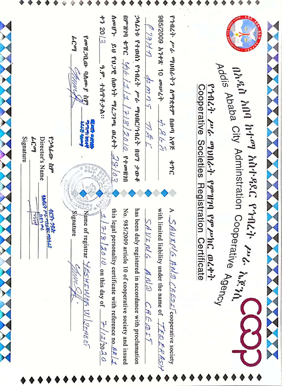 Tederash SACCOS (LTD) is a saving and credit cooperative established on July 2, 2009 E.C in Addis Ababa Arada Sub city by Alemayehu Tamene, founder and 24 founding members (Male 15 and Female 9) of the Ethiopian Cooperative Proclamation No. 147/91 and Amendment Proclamation No. 985/2009. Tederash Received Legally Recognized Certificate by Registration No. A / 1/1/718/2010 on November 14, 2010 E.C and forming a cooperative to collectively overcome, withstand and solve economic and social problems which members cannot individually achieve. It mainly focuses on the economical growth of community-based financial institution by coordinating money, knowledge, resources, and labor and considering capacity of saving culture with a system of equitable loan interest rates and affordable shareholder that recognizes the potential of the community.